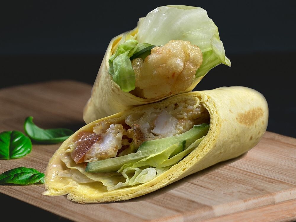 Тортилья, лук красный, соус, салат, креветка, томаты, огурец.