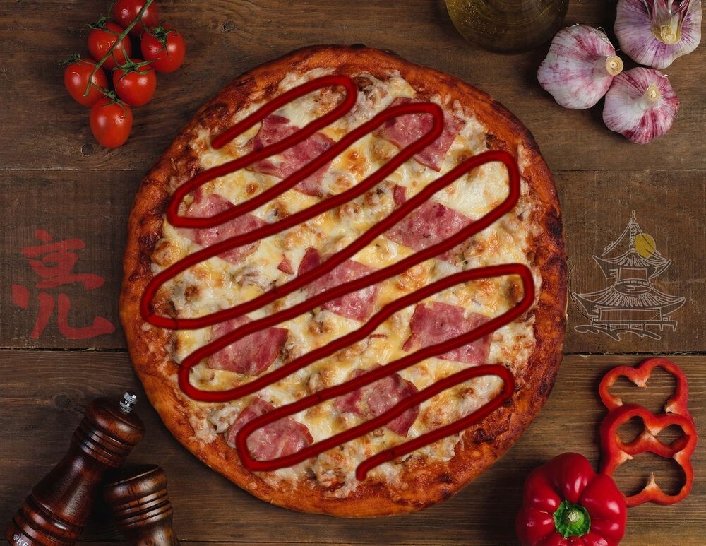 Курица, красный лук, бекон, томатный соус, барбекю, моцарелла, голландский сыр.
