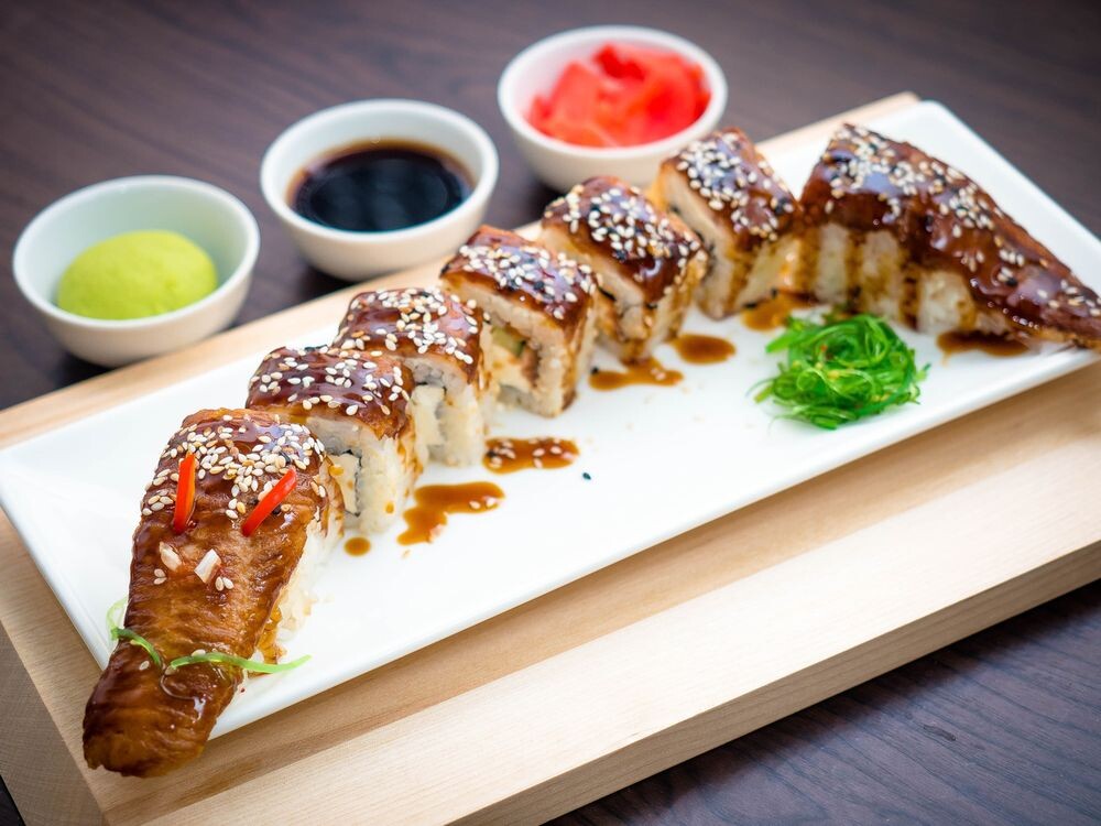 Рис, сливочный сыр, угорь, унаги соус, кунжут, острый соус.