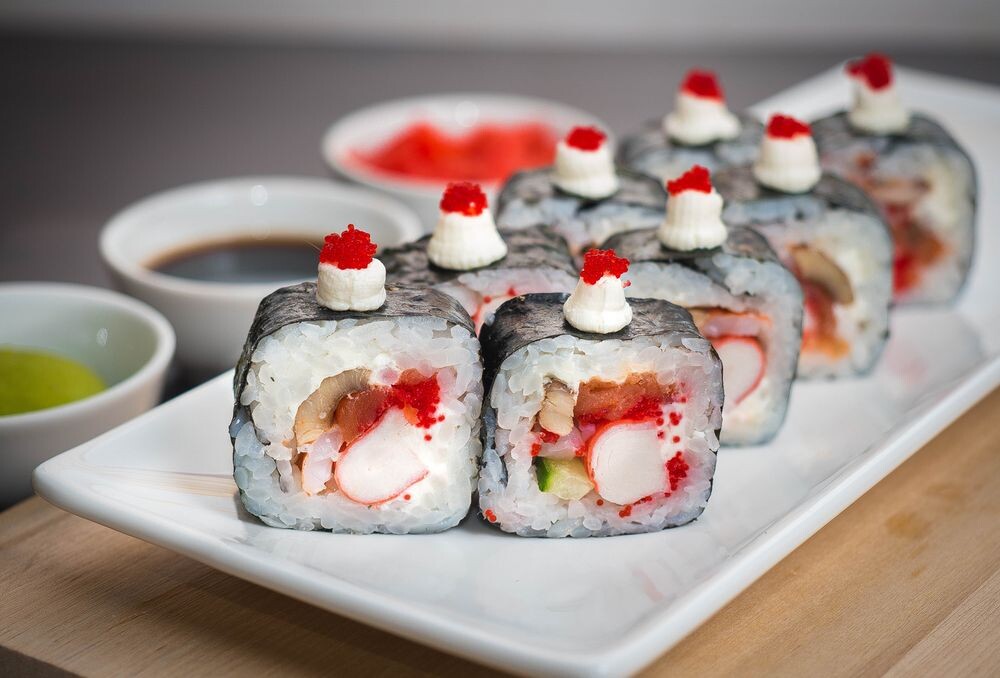 Рис, огурец, сыр, краб (имит.), угорь, лосось, креветка Сливочный сыр, тобико.