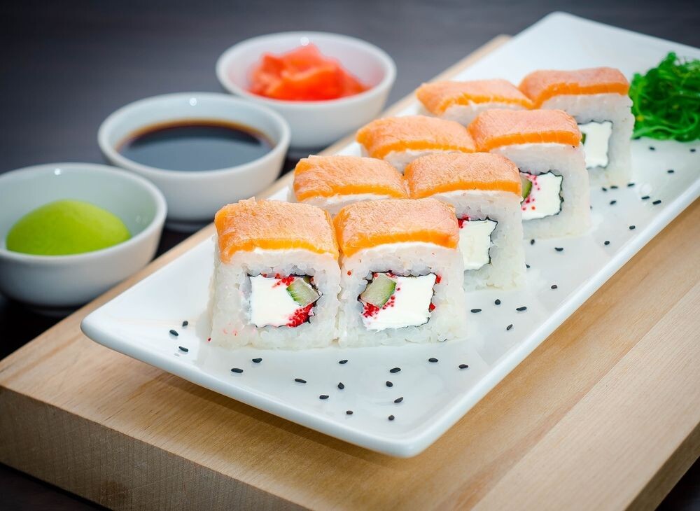 Рис, сливочный сыр, икра тобико, огурец, лосось.