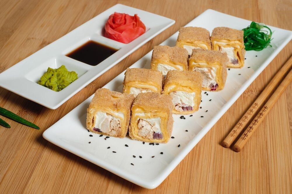 Сырная тортилья, сыр, лук крас., панир.сухари, соус тар-тар, соус спайс, кляр.