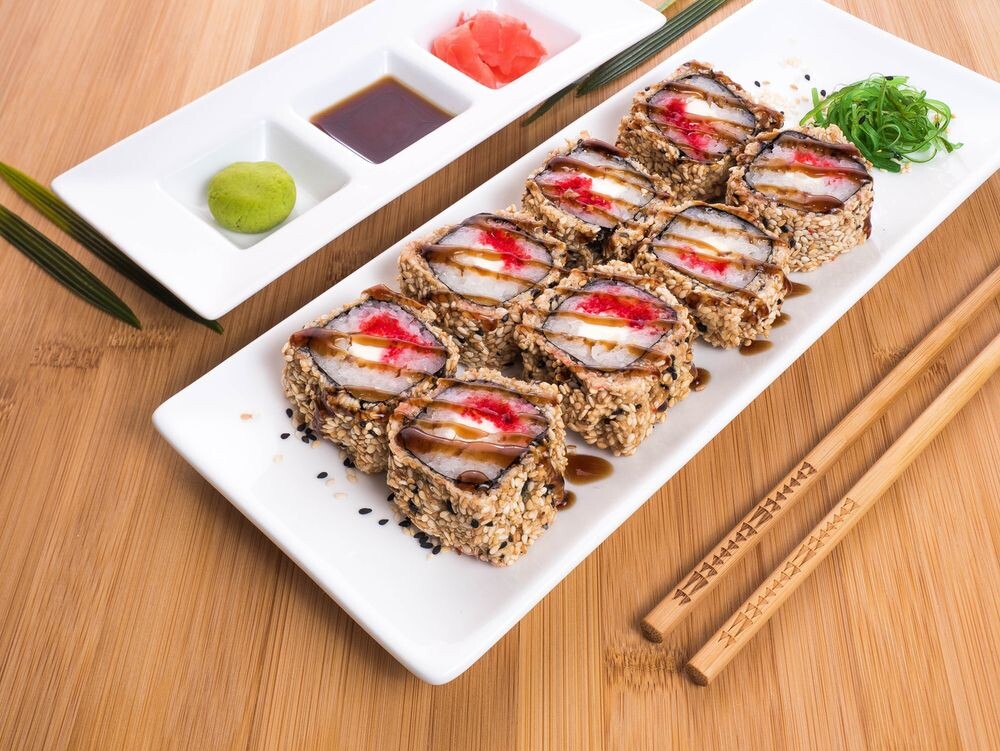 Рис, сыр, икра тобико, пан.сухарики, соус унаги.