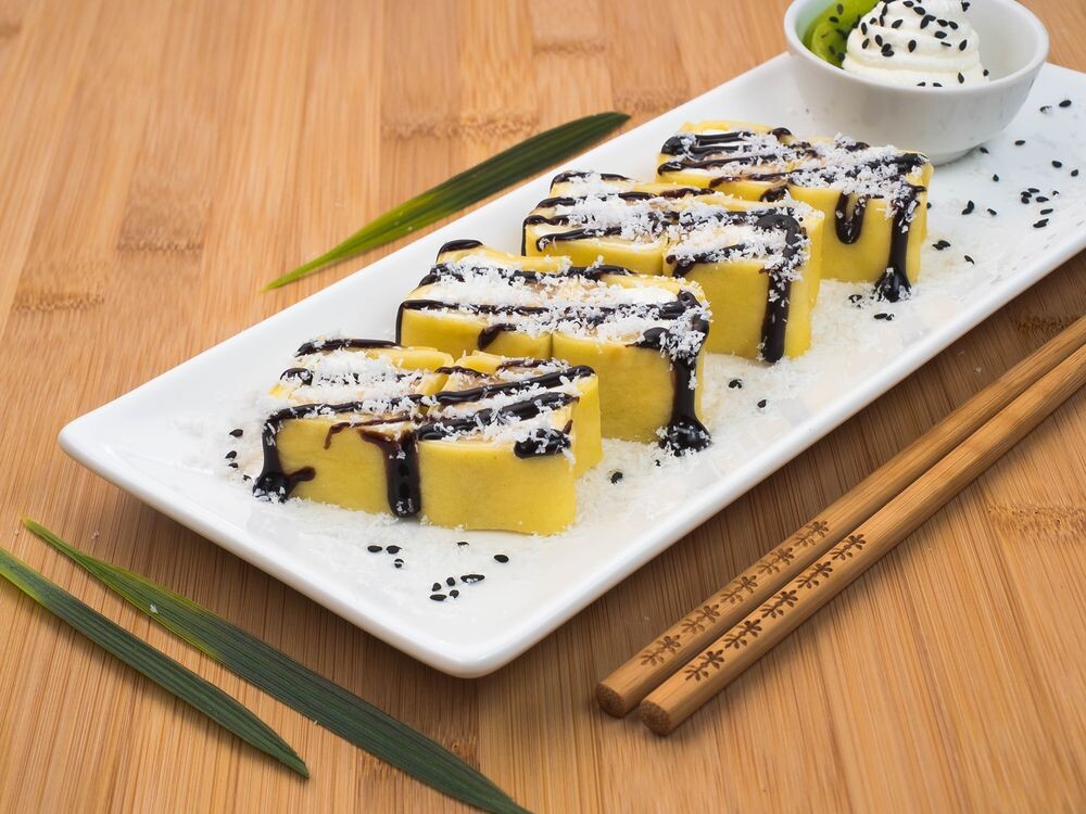 Омлет Томаго, банан, ананас, сливочный сыр, кокосовая стружка, шоколадный топинг.