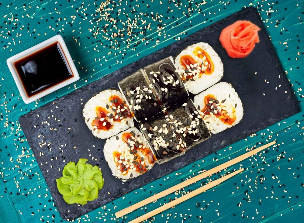 Рис, угорь, соус унаги, кунжут.