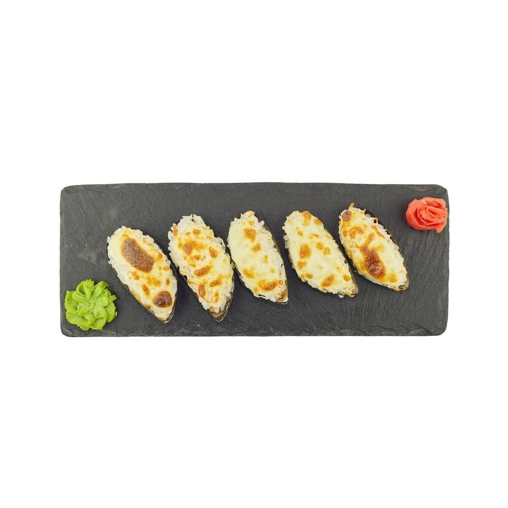 Запеченые мидии, рис, соус тар-тар, унаги соус, сыр моцарелла.