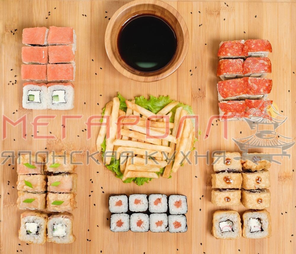 Филадельфия, Цезарь в кляре, Ролл Пеппер, Монтана в кляре, Ролл с лососем, Картофель фри.