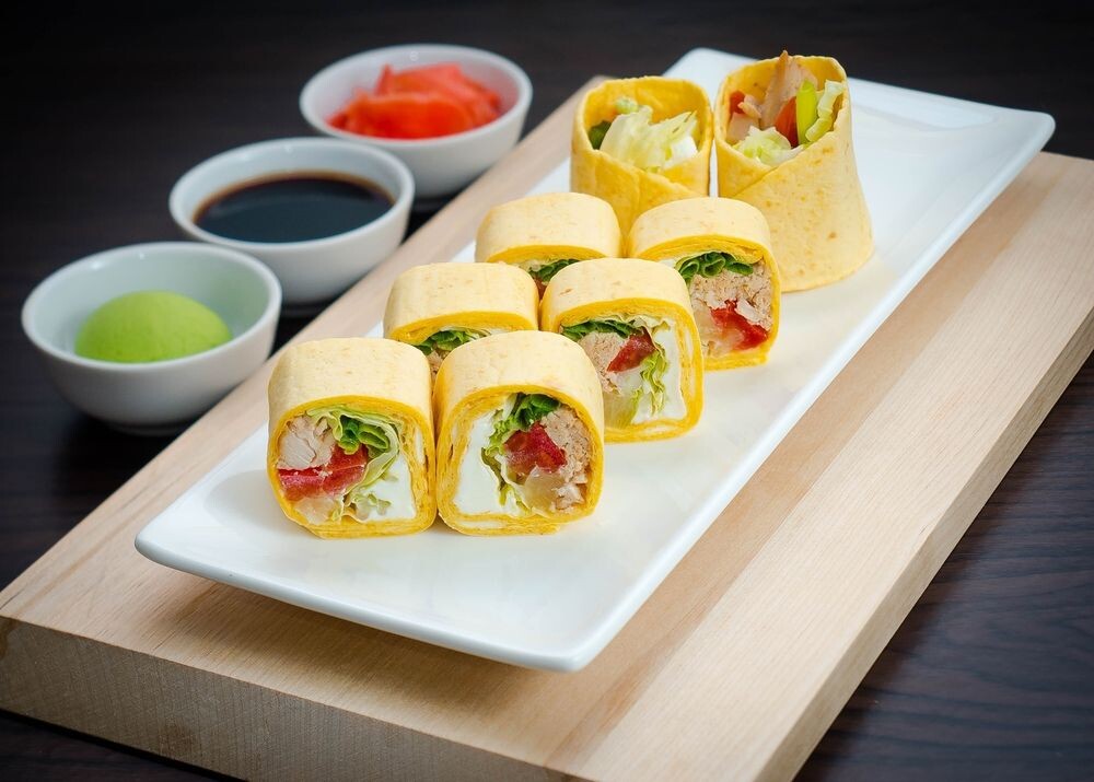 Сырная тортилья, курица, пекинка, томат, ананас, пармезан, лук.