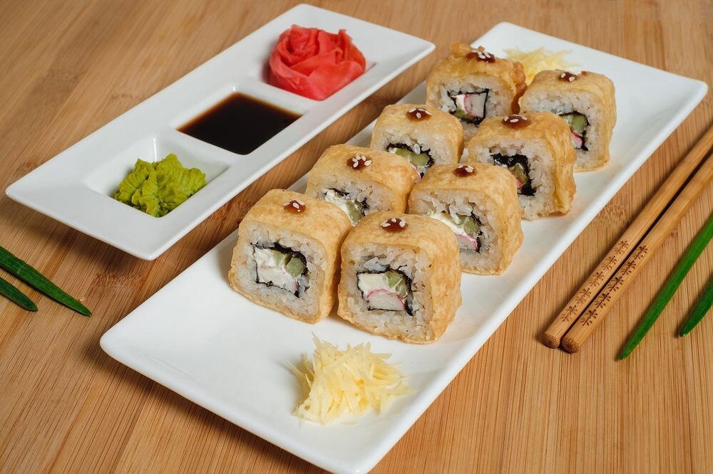 Рис, нори, сыр, огурец, краб(имит.), пармезан, майонез, кляр.