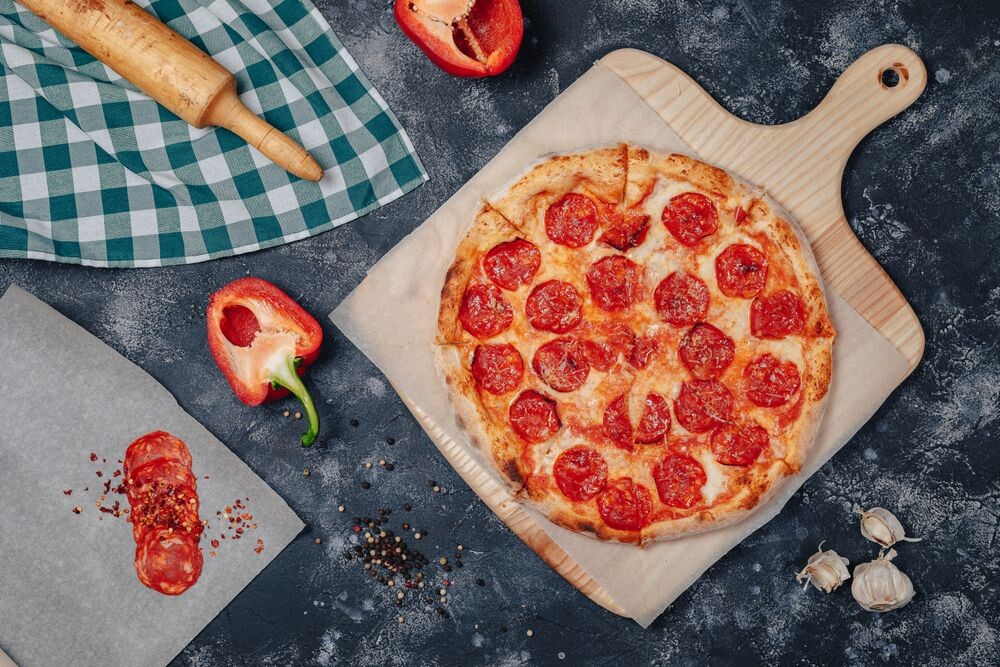 Фирменный соус , сыр моцарелла, сыр голландский, пепперони