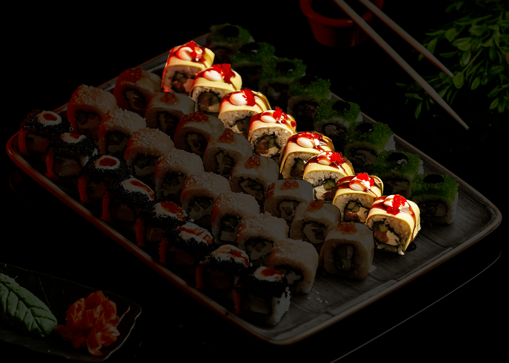 Рис, сливочный сыр Креметта, лосось, сыр Чеддер, угорь, огурец, авокадо, икра тобико, брусничный соус